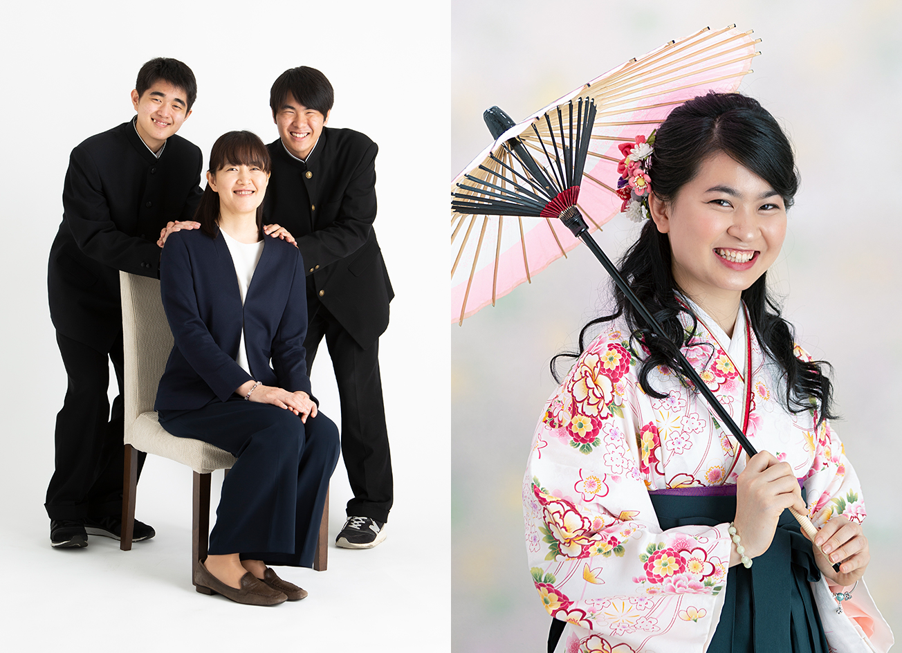 結婚、マタニティー、出産、お七夜、お宮参り、お食い初め(百日の祝い)、初正月、初節句、初誕生、髪置き・袴着・帯解き(この三つをまとめて「七五三」とも言います)、還暦(60歳)、古希(70歳)、喜寿(77歳)、傘寿(80歳)、米寿(88歳)、卒寿(90歳)、白寿(99歳)、百寿(100歳)、錫婚式(結婚10周年)、水晶婚式(15周年)、磁器婚式(20周年)、銀婚式(25周年)、真珠婚式(30周年)、ルビー婚式(40周年)、金婚式(50周年)、ダイヤモンド婚式(60周年)など、ご家族の大切な瞬間を迎えた喜びの瞬間を、ご家族「そろって」の綺麗な時を写真に残してみてはいかがでしょうか。